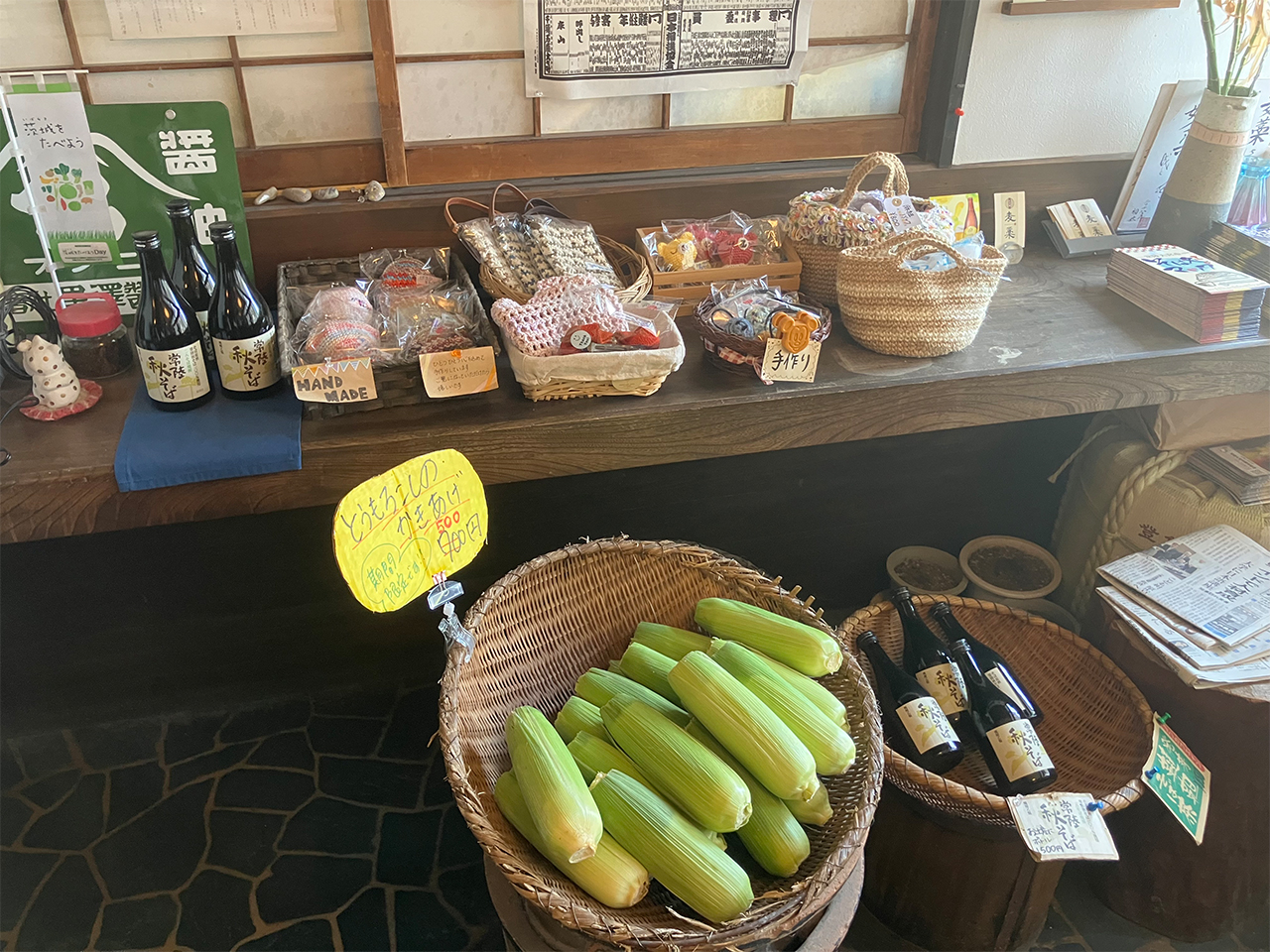 出入口近くには、ハンドメイドの小物と一緒に野菜やこだわりのそば焼酎も売っています。地元に愛されているお店なのが分かります。