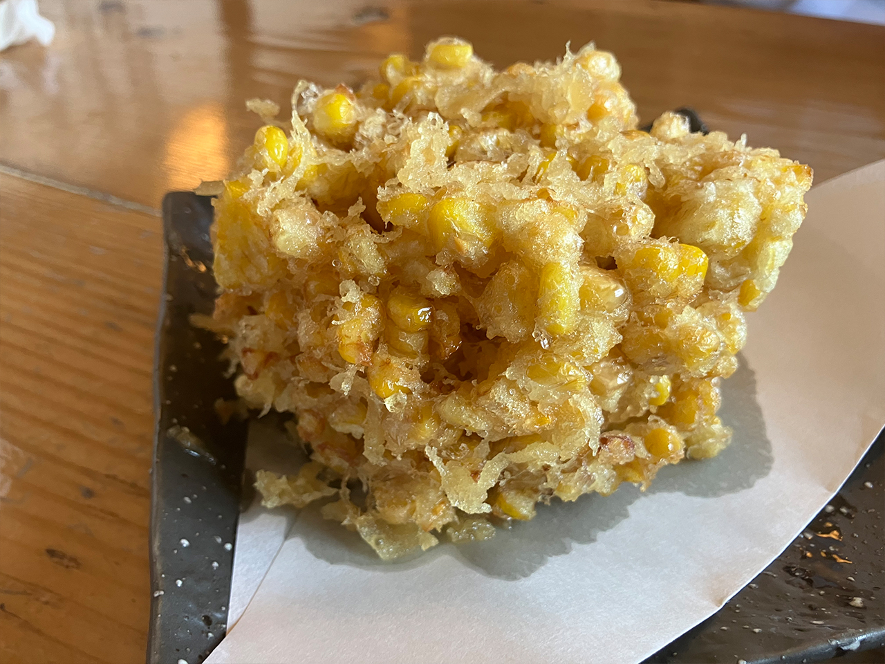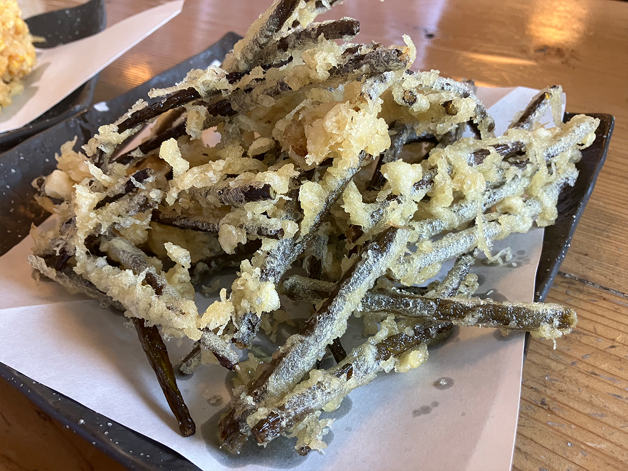 まずは入口に書いてあった珍しい「わらびの天ぷら」と本日のおすすめ「とうもろこしかきあげ」を注文。