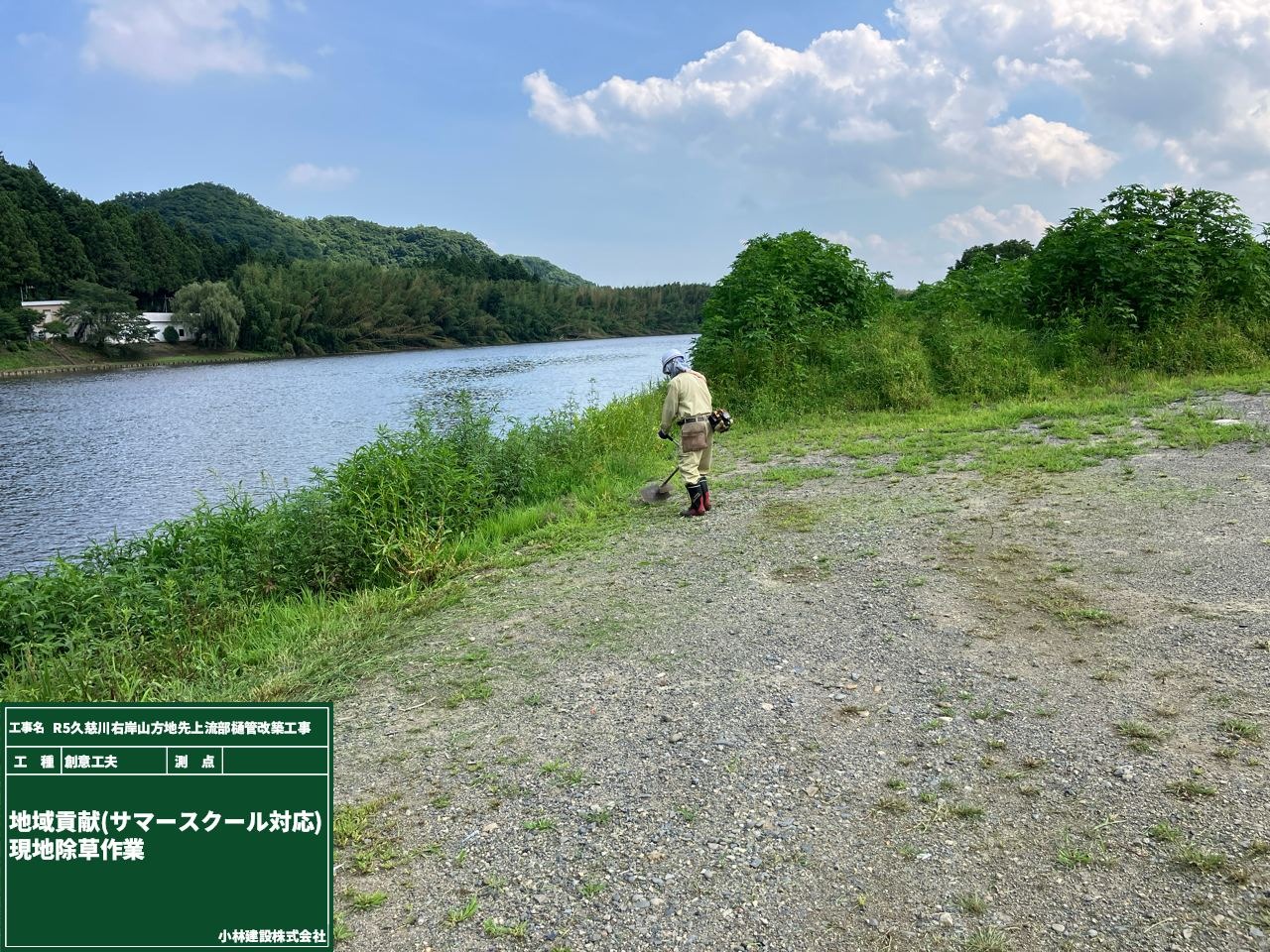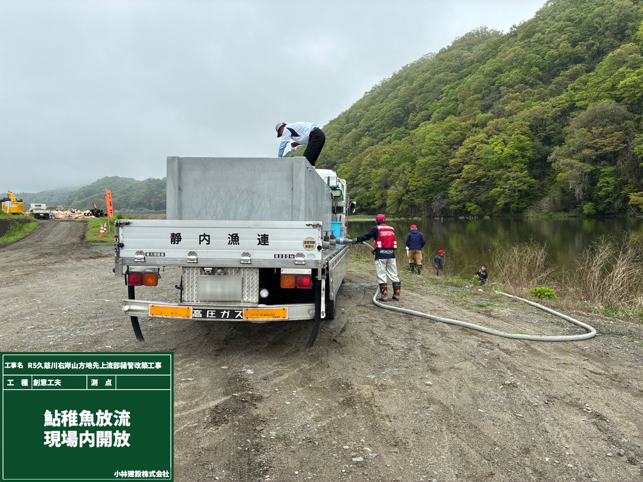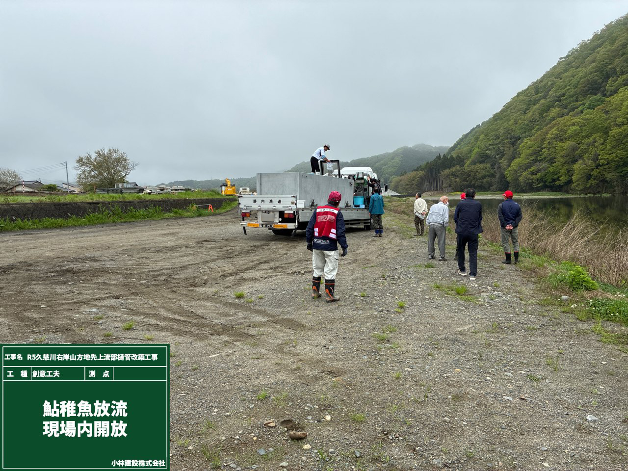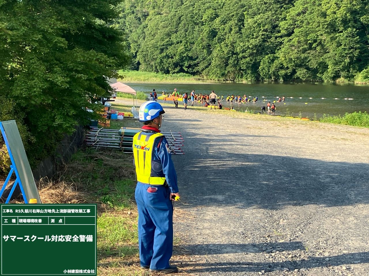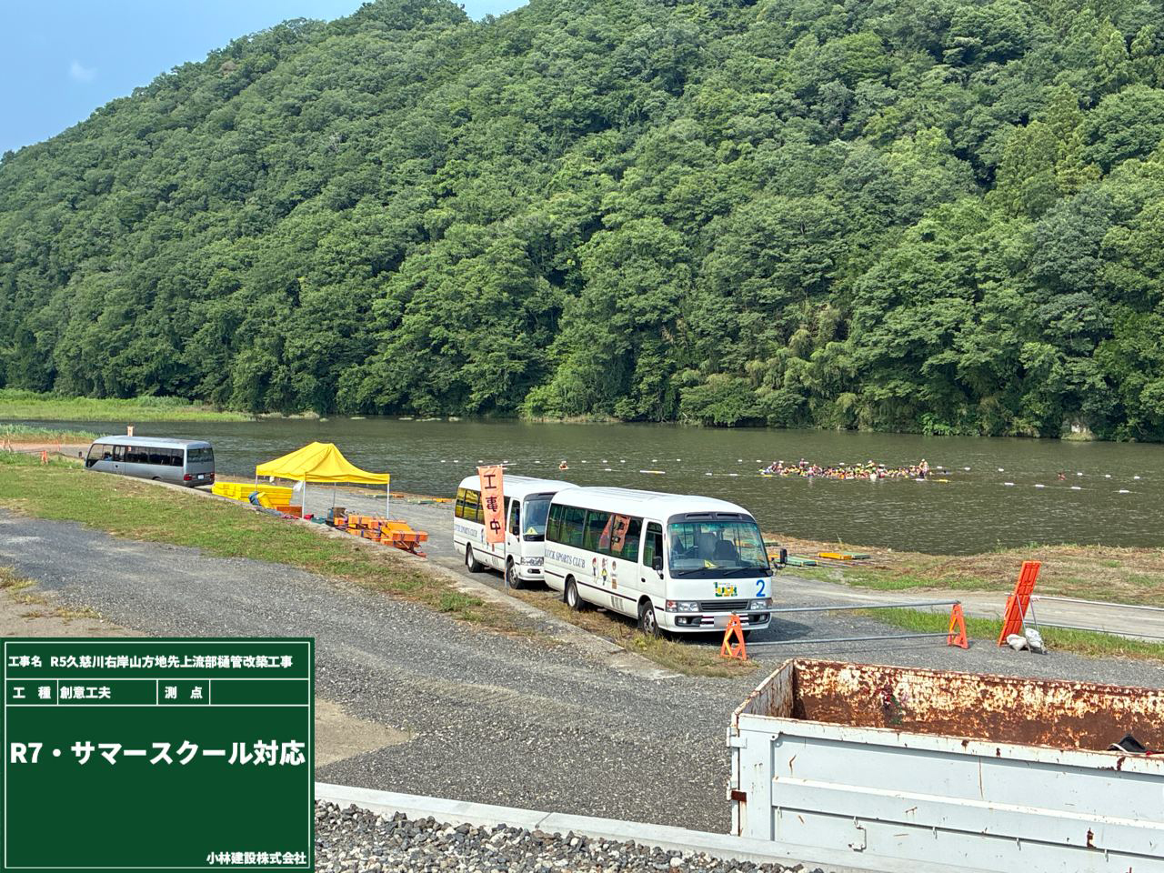 施工場所のすぐ傍で子供たちが川に入っていて、普段とは違う賑やかな声が現場に響いています。