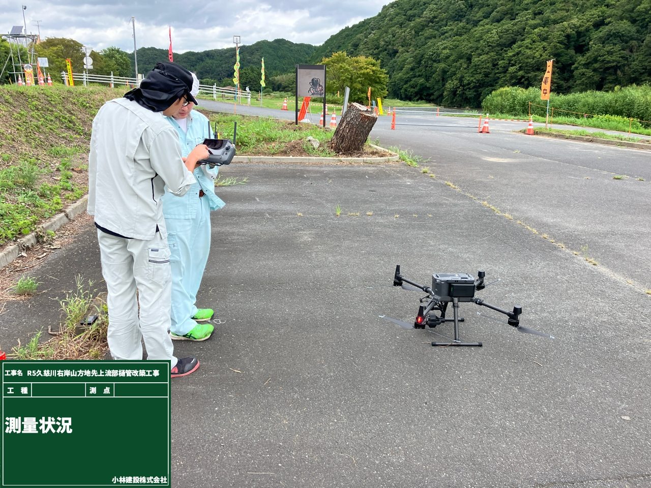 話は変わり、こちらは測量の様子です。今回はドローンを使って測量をしました。
