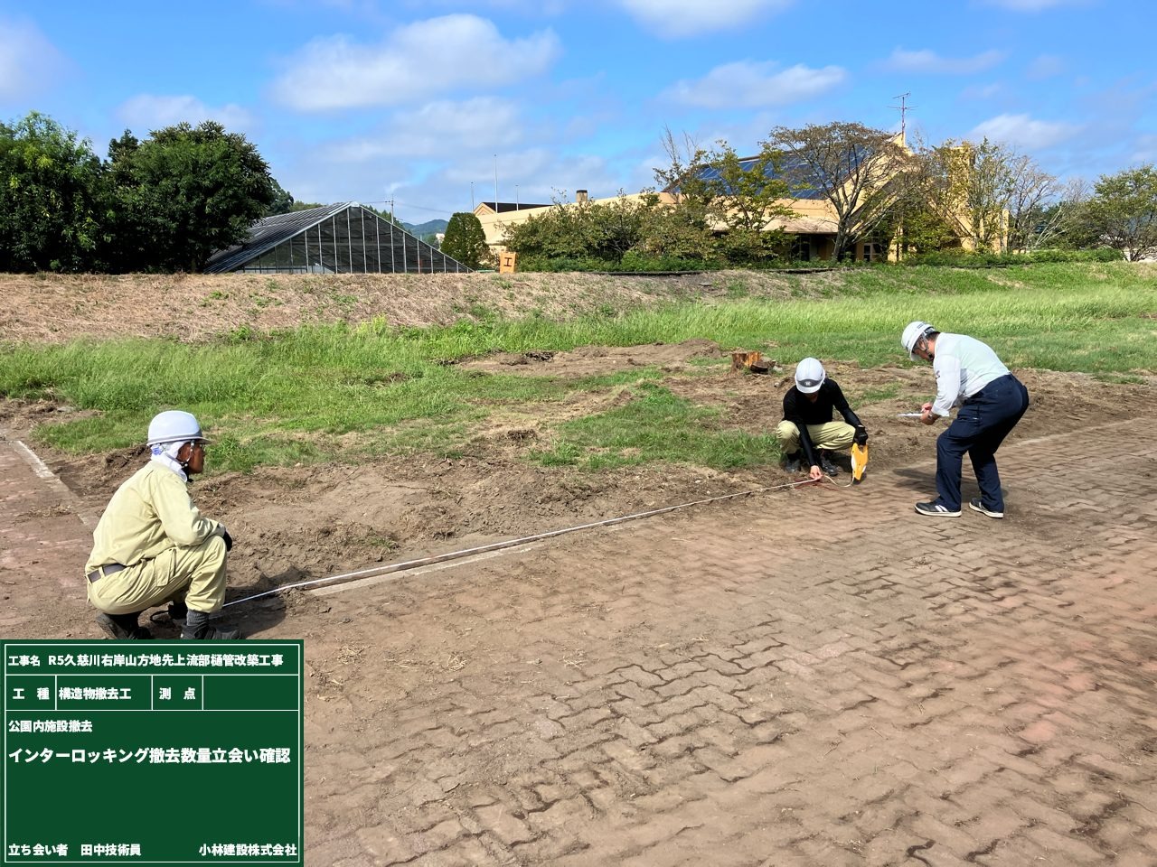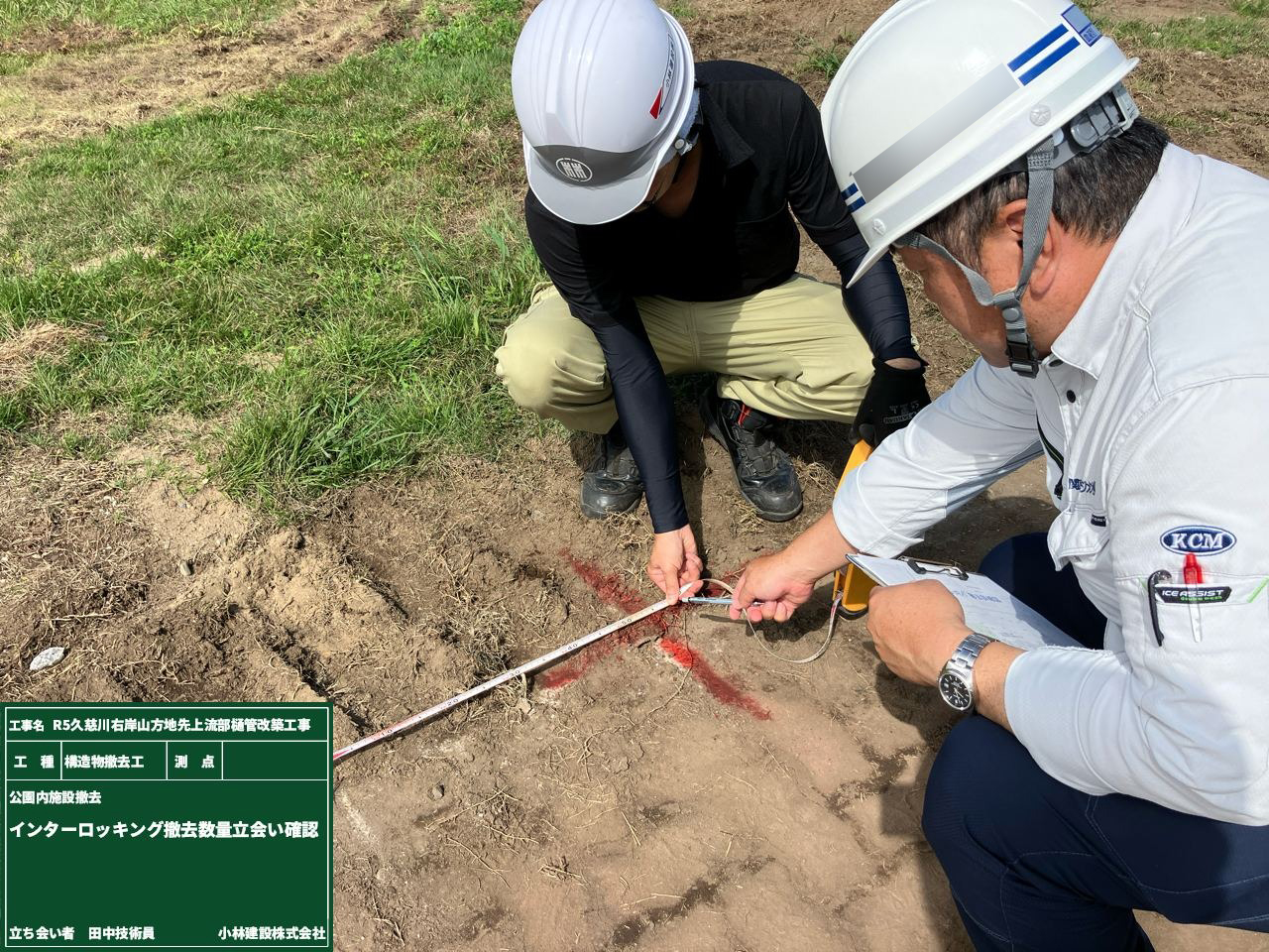 撤去したブロックの量を把握するためにも寸法測定が必要になるので、発注者立会のもと寸法測定をしています。