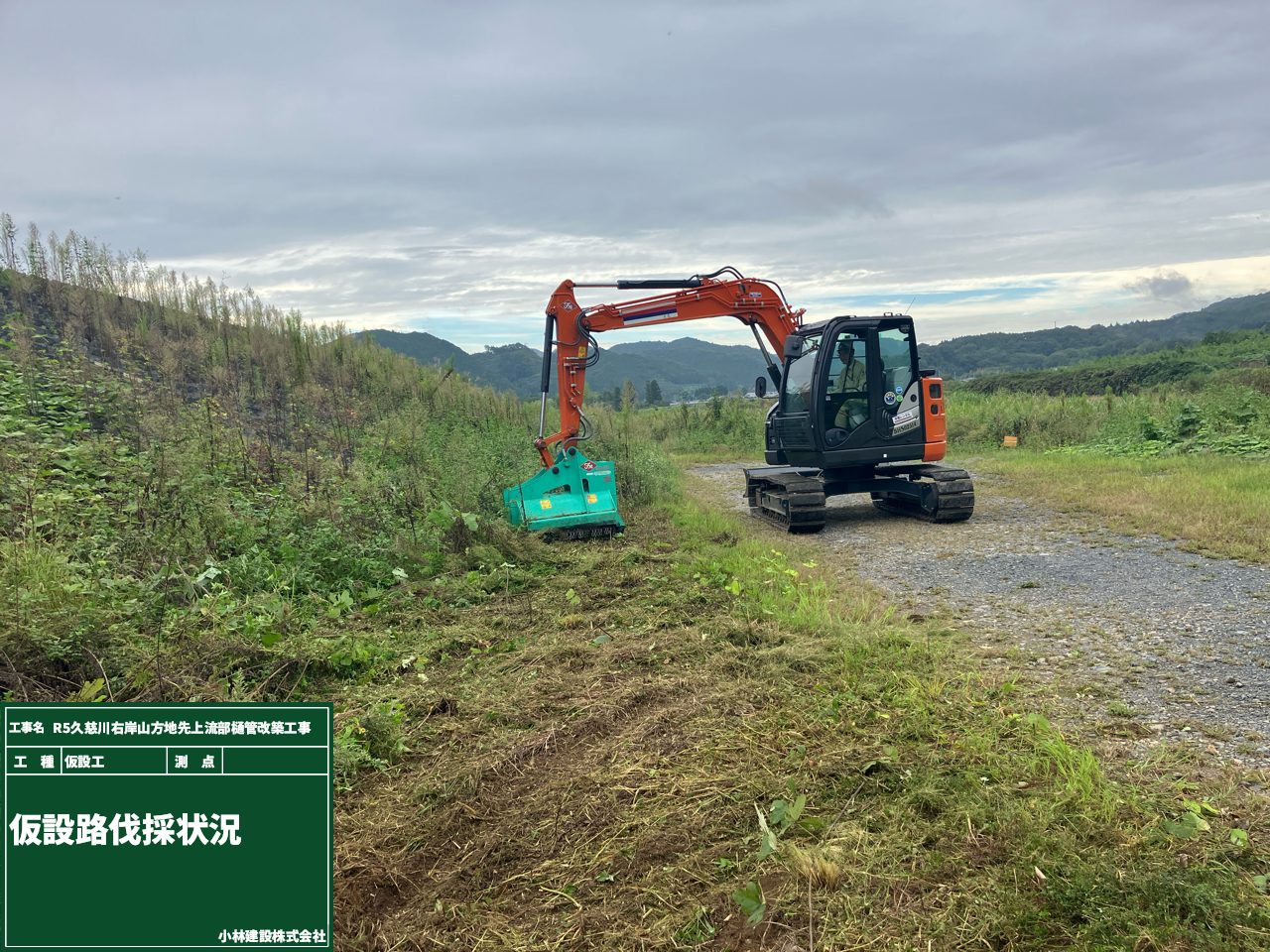 仮設路の伐採を、油圧ショベルに搭載する草刈り専用のアタッチメントを装着して行っています。