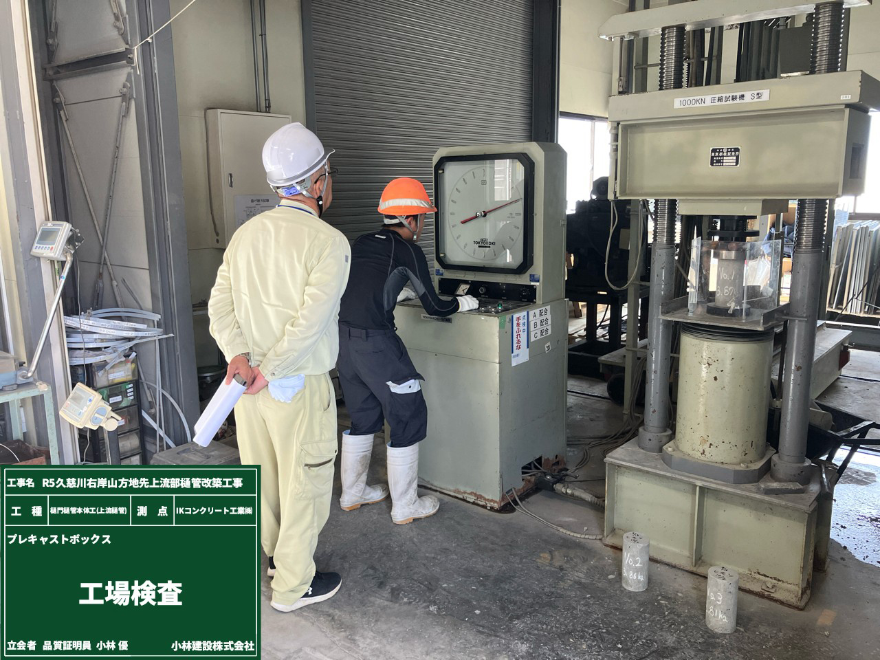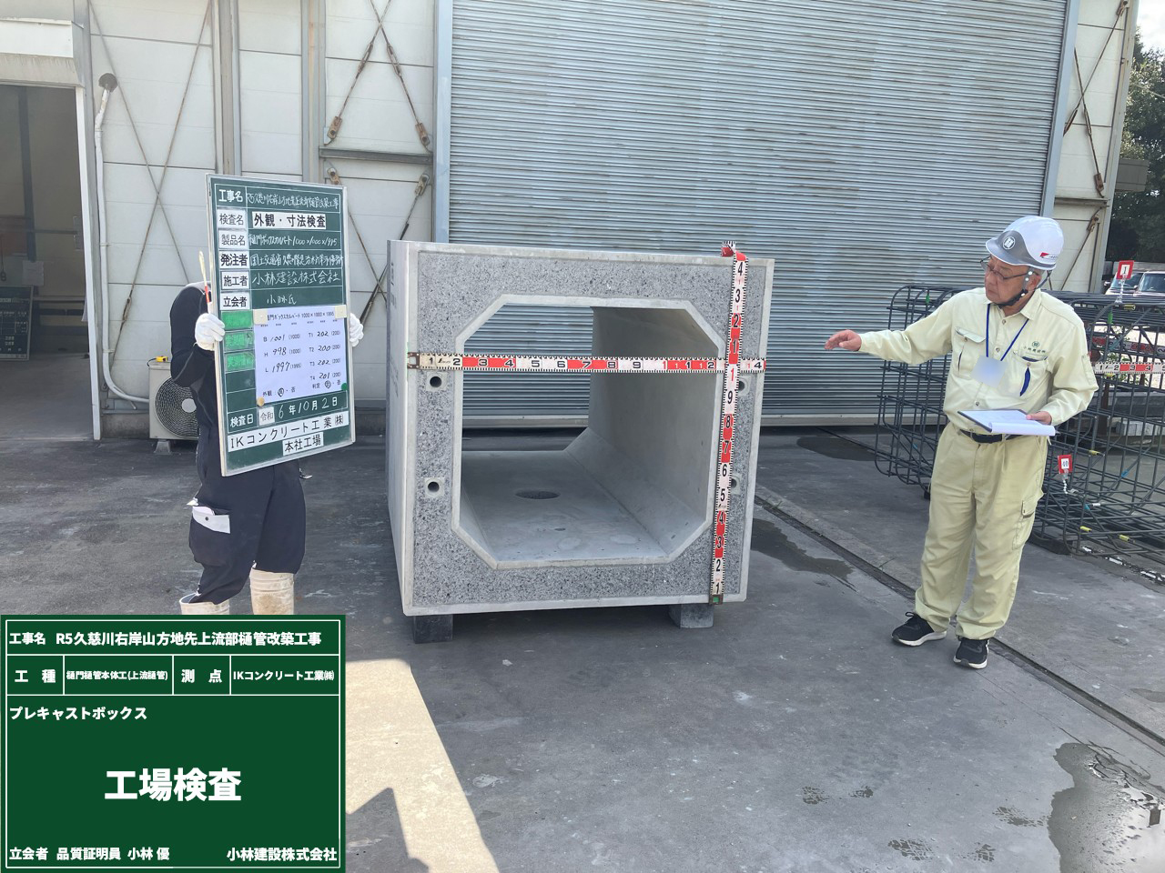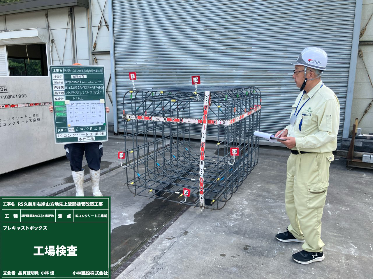 今回はプレキャストのボックスカルバートを使用するため、製造工場での品質検査となりました。