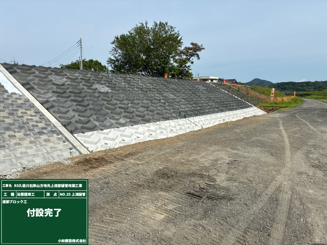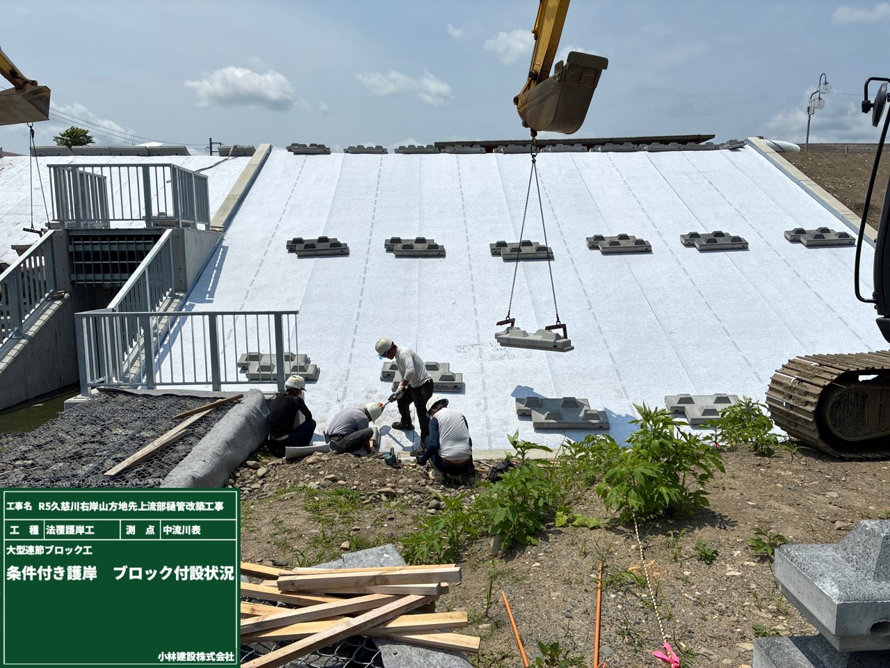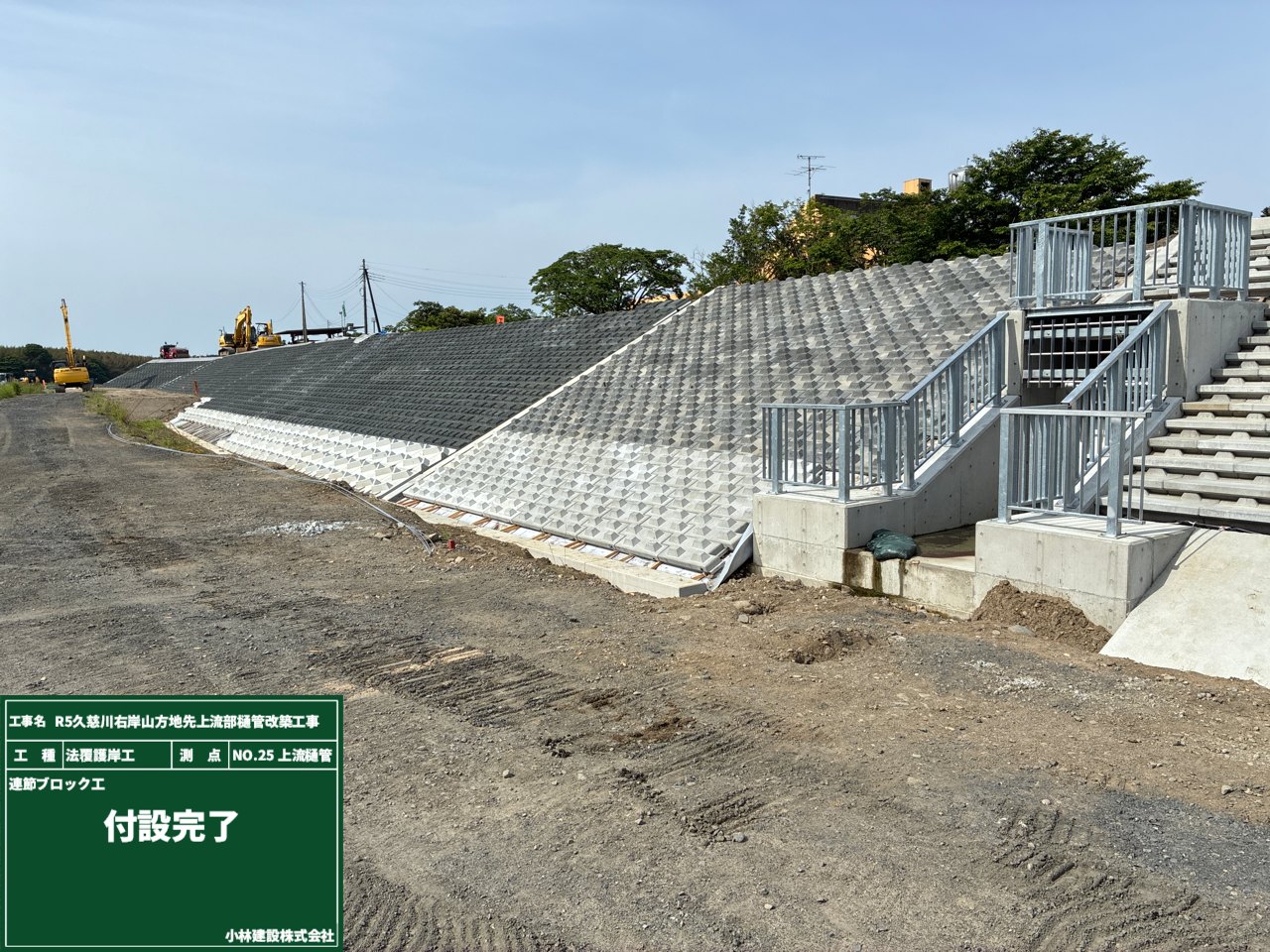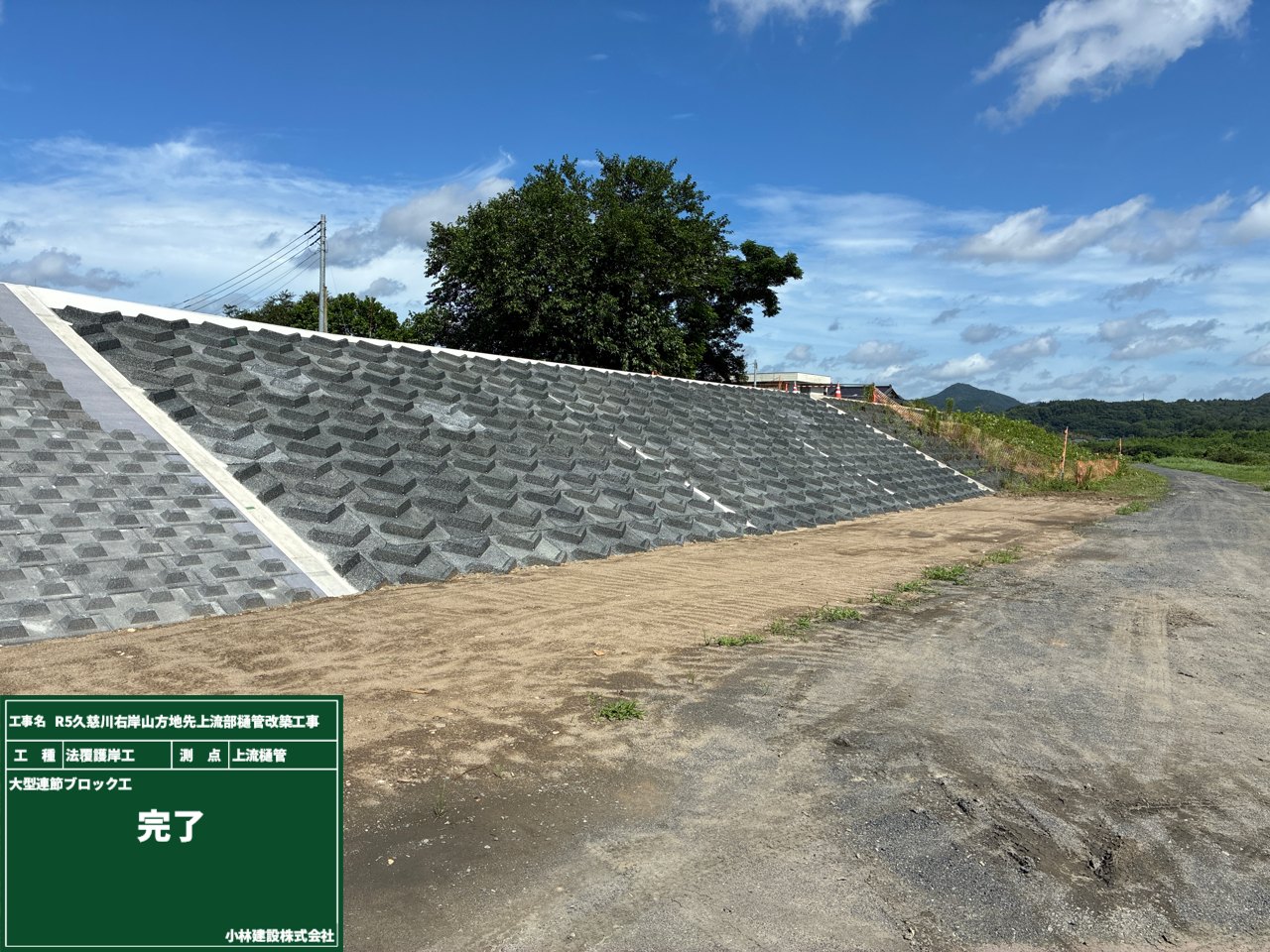 ここ最近の現場ホームページで作業の様子をご紹介していましたが、ついに上流樋管の場外水路工と、大型連節ブロックの作業が完了しました!!