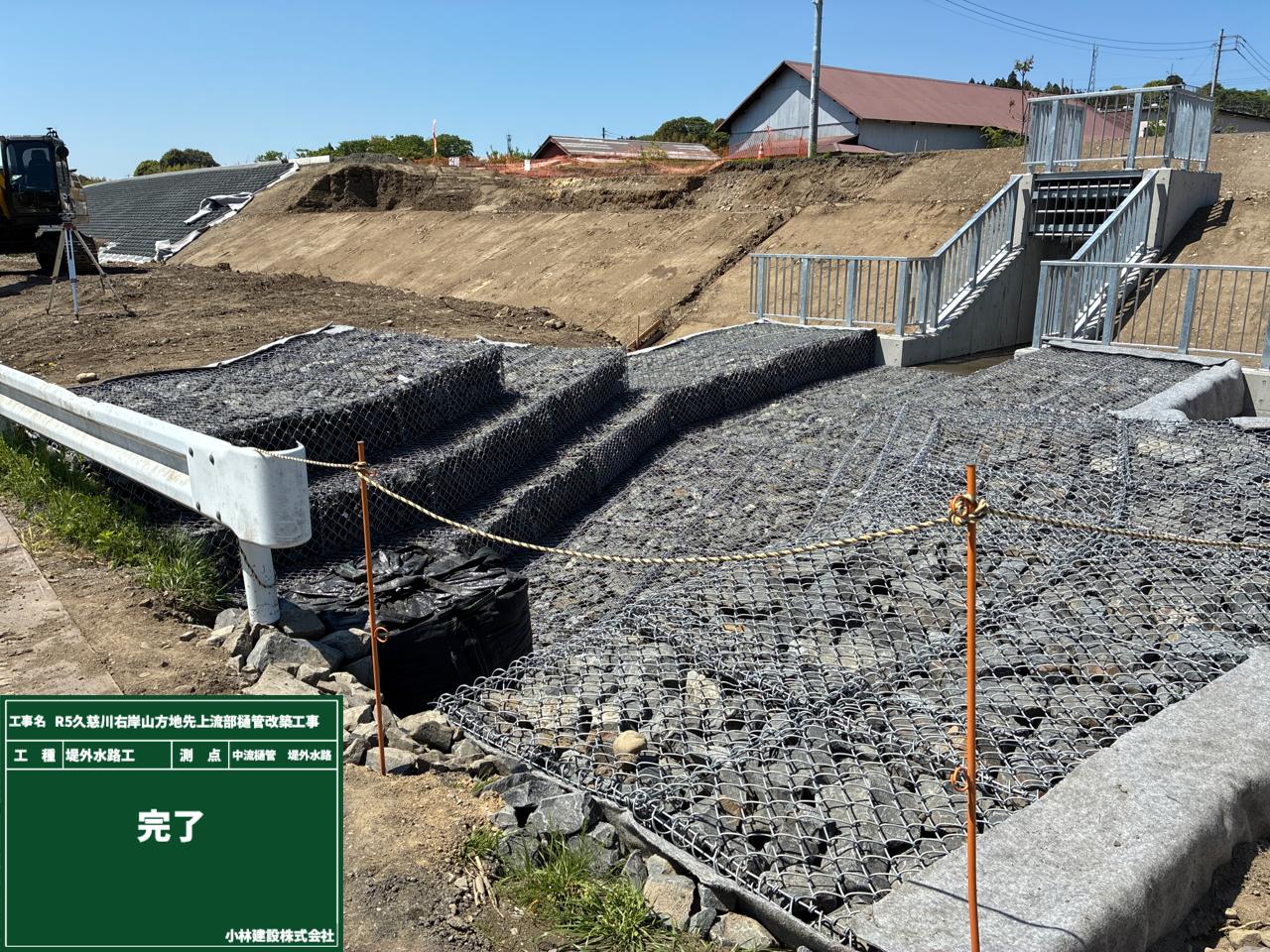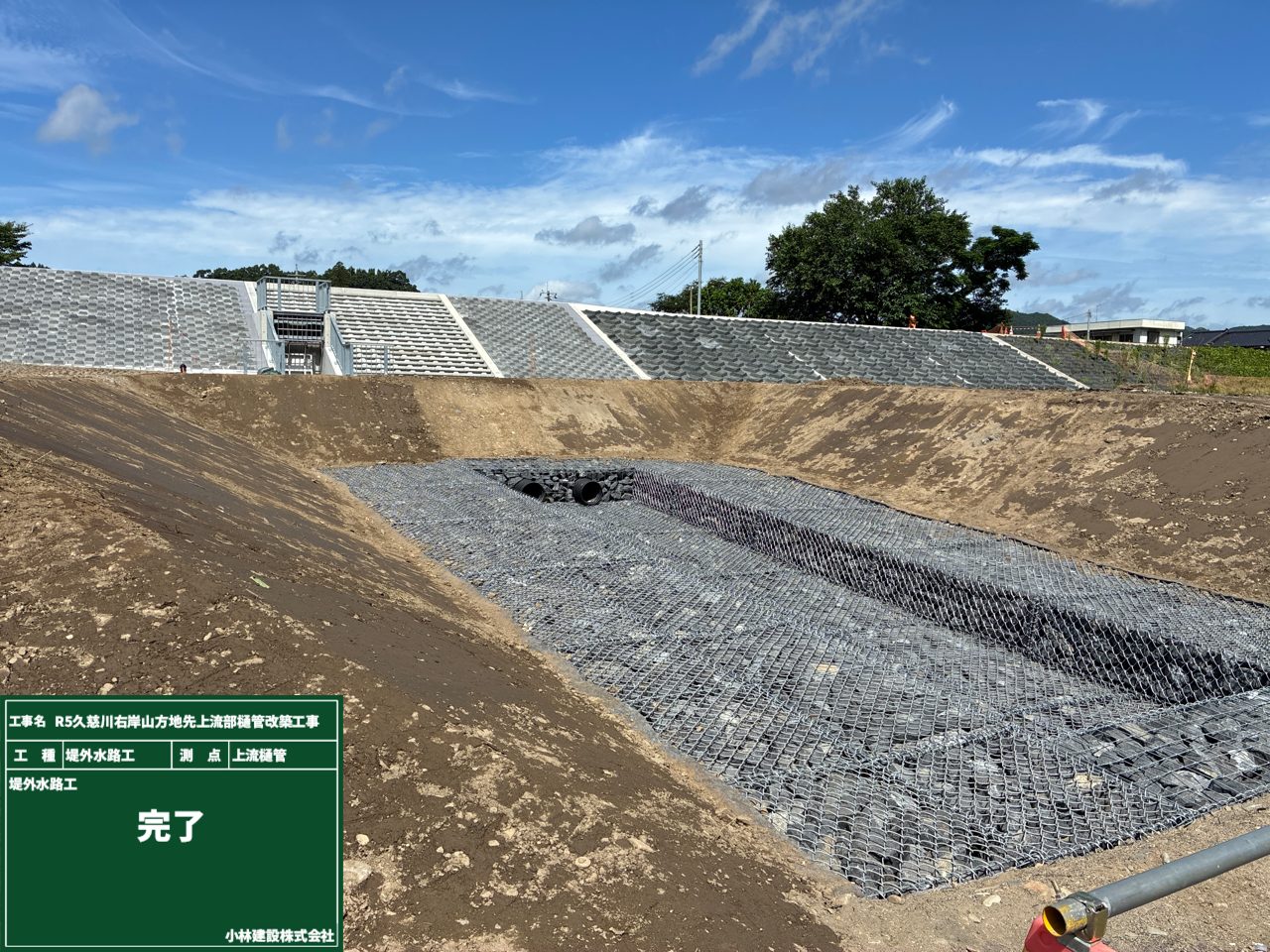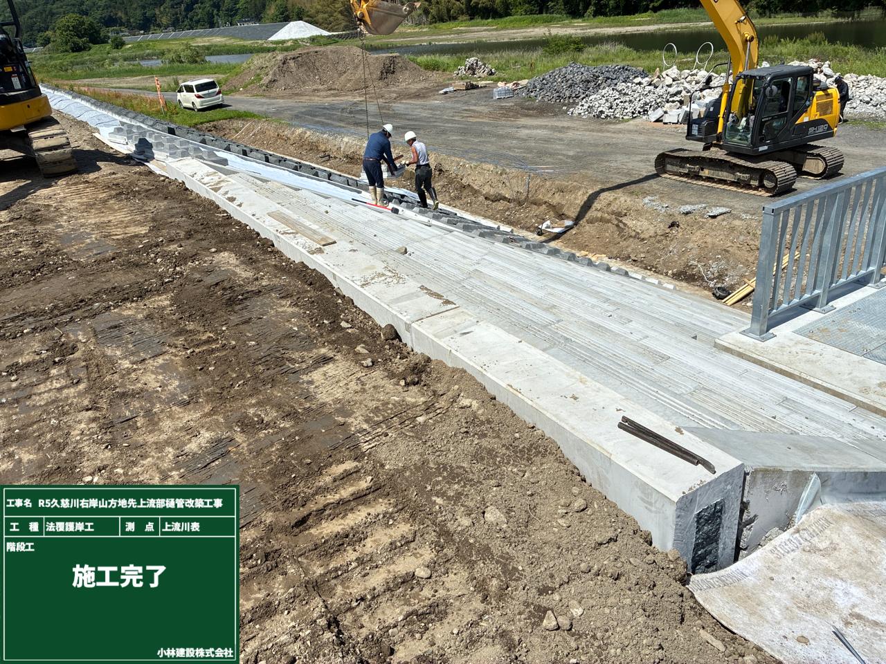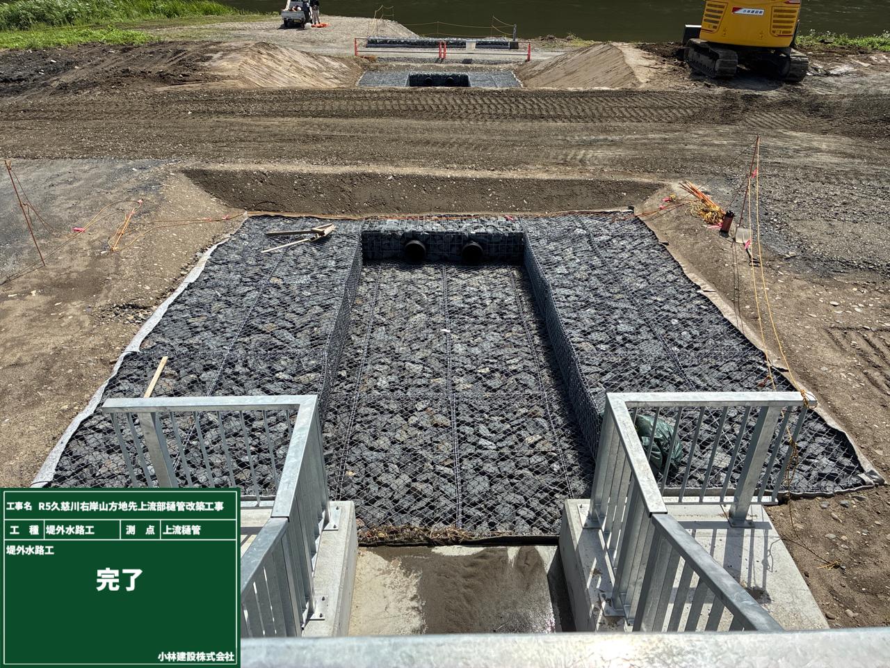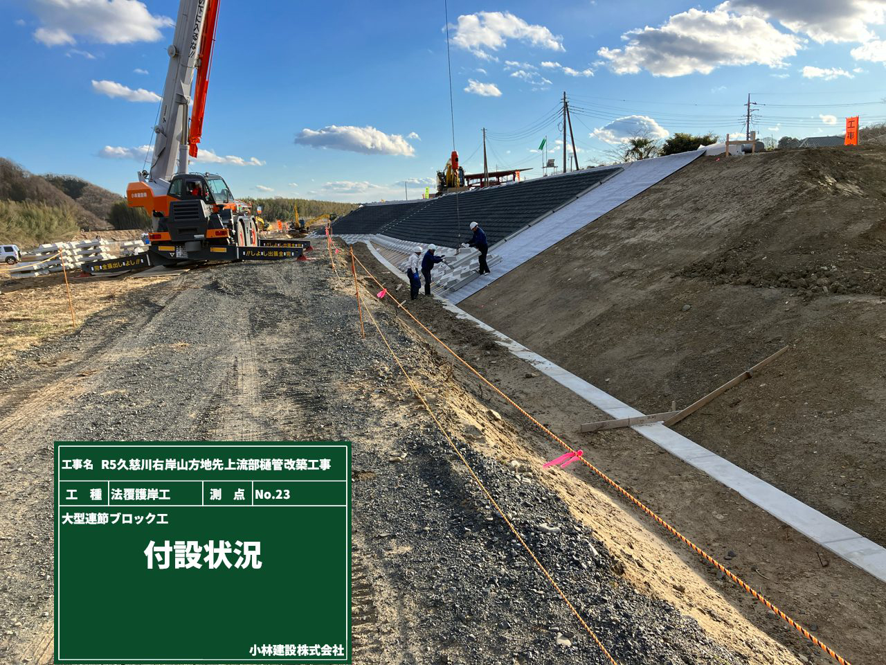 ここ最近の現場ホームページで作業の様子をご紹介していましたが、ついに上流樋管の場外水路工と、大型連節ブロックの作業が完了しました!!