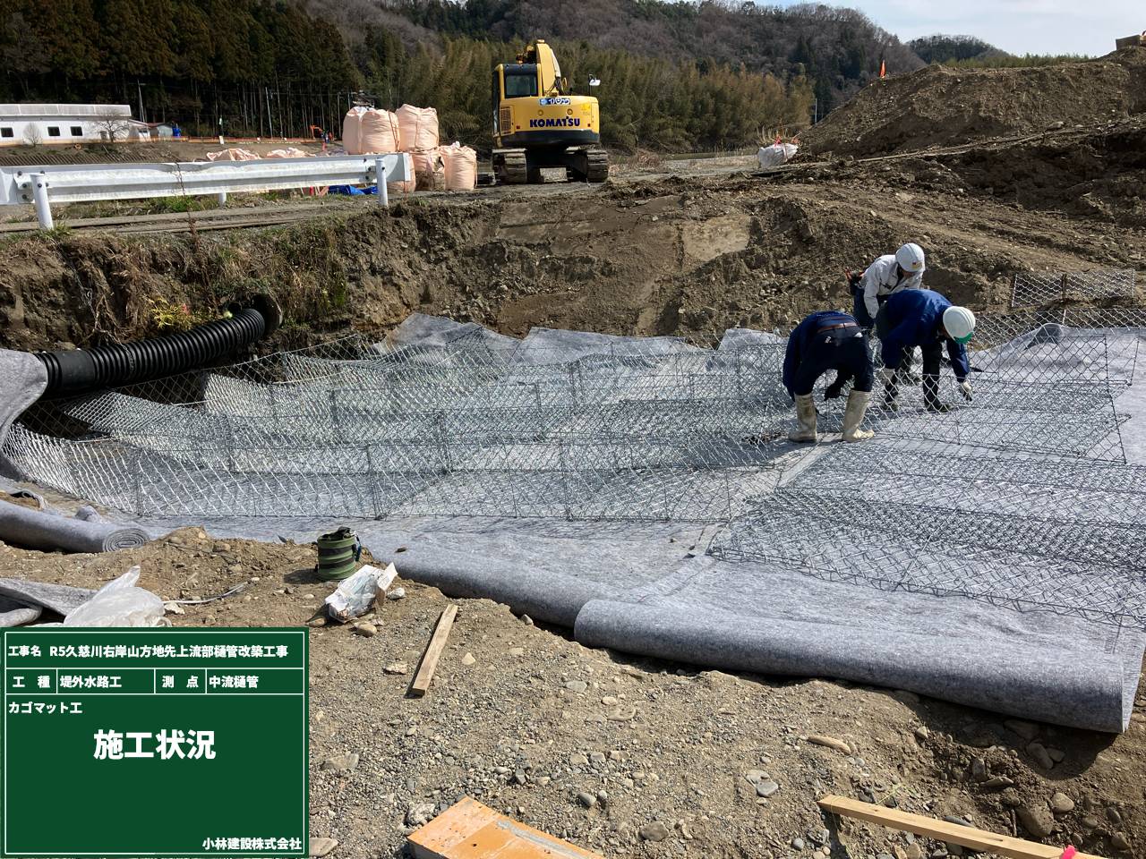 すでに中流樋管に設置済みのカゴマットを、上流樋管にも設置する作業を行っています。