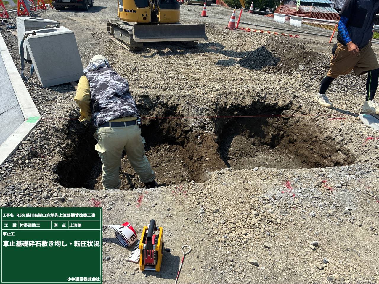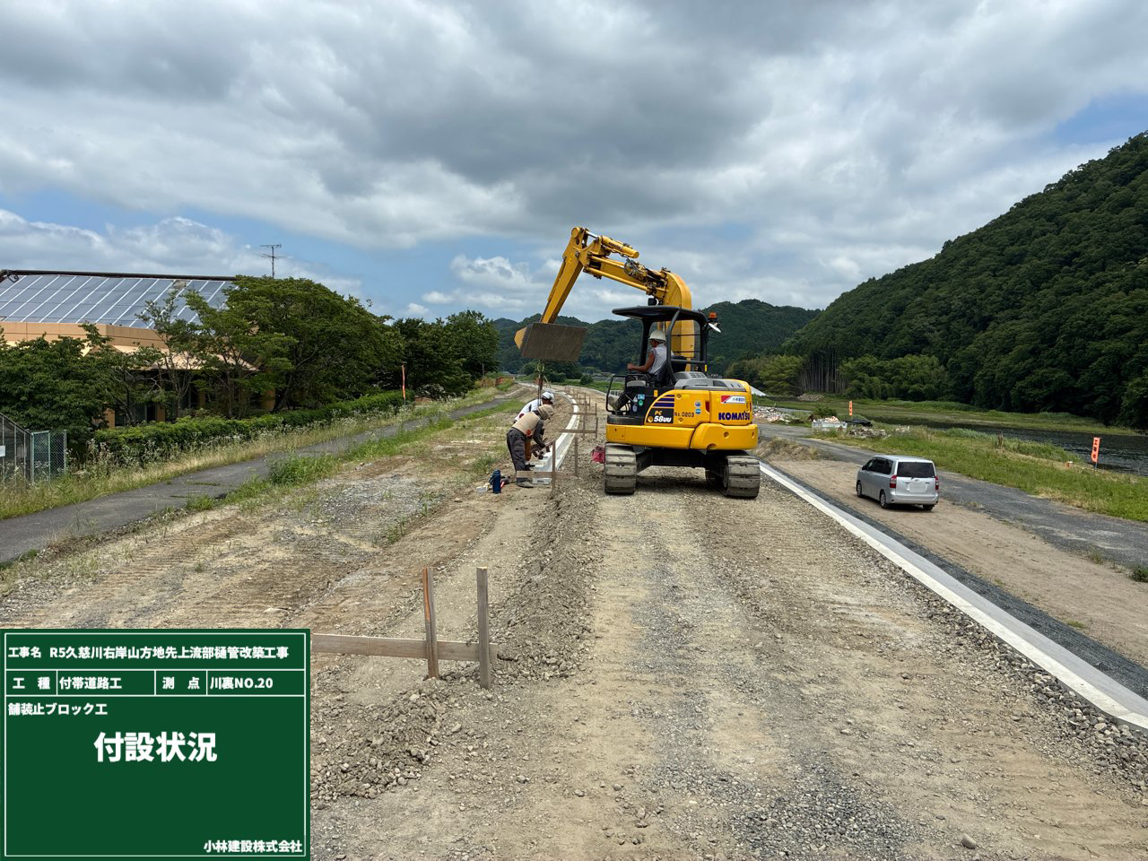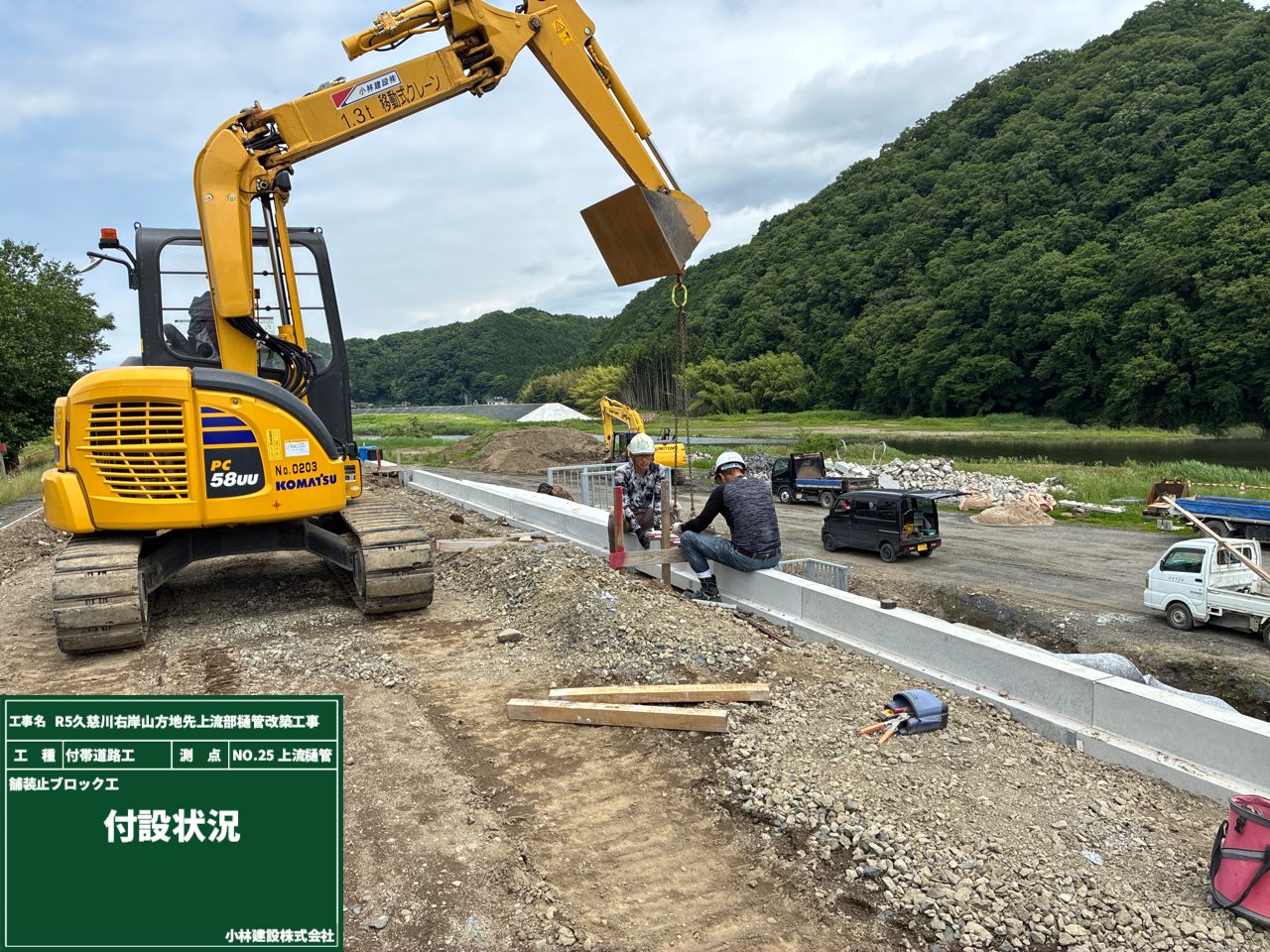 現場では、舗装止めブロックの作業が順調に進んでいます。