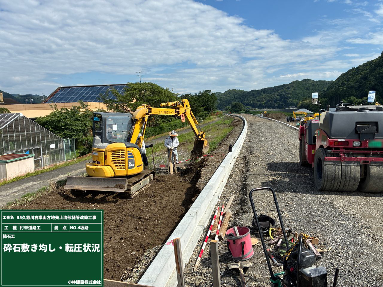 大まかな流れは、路盤の砕石敷均し・転圧⇒現場密度試験⇒乳酸散布⇒アスファルト舗装 です。