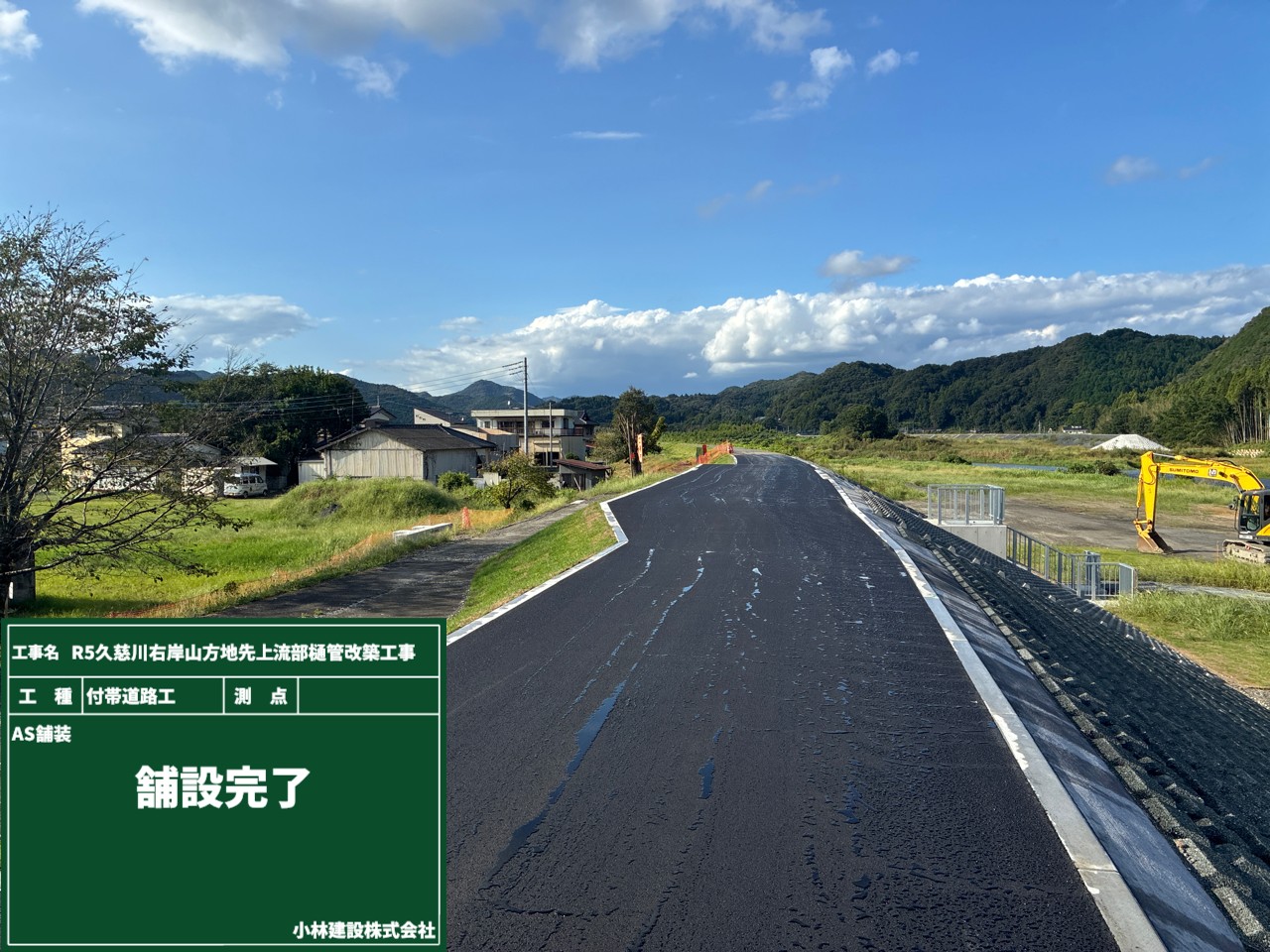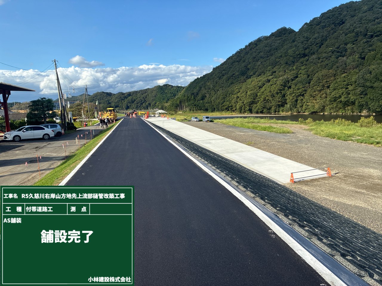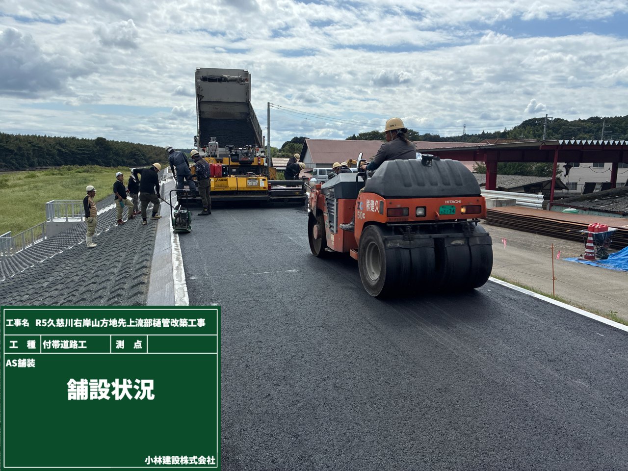 作業も最終局面!堤防天端のアスファルト舗装がスタートしました。