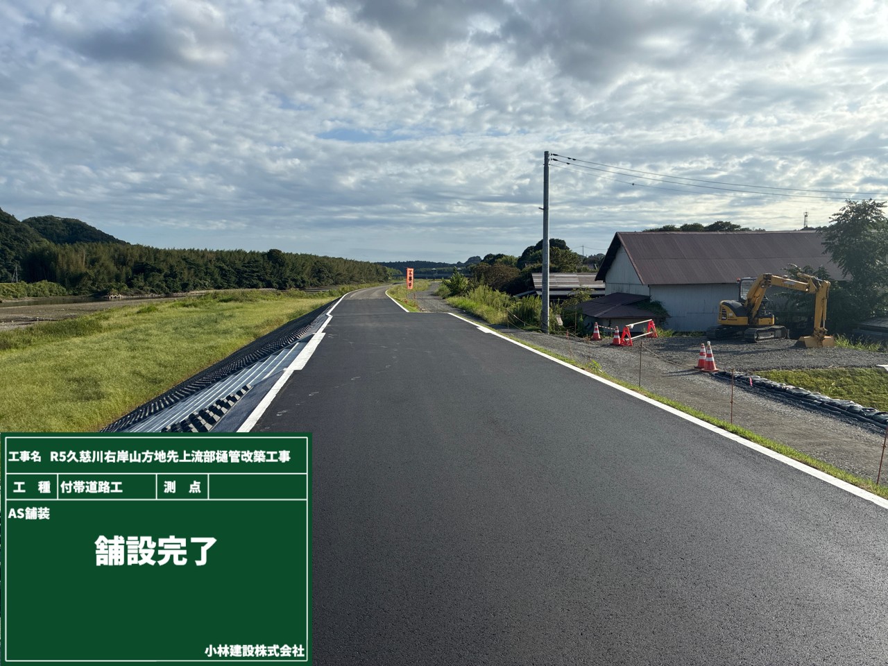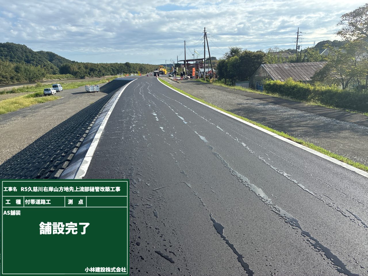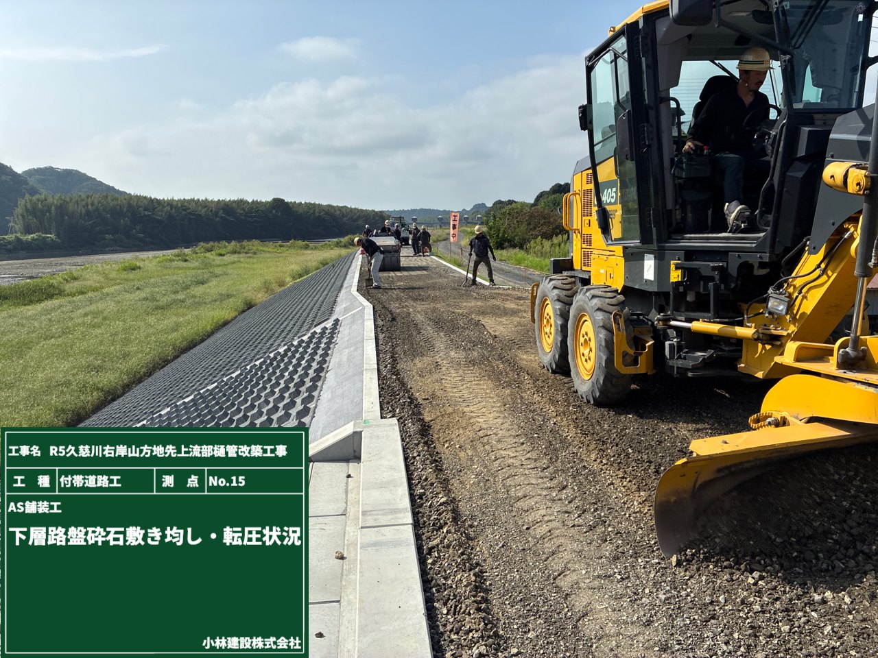 作業も最終局面!堤防天端のアスファルト舗装がスタートしました。